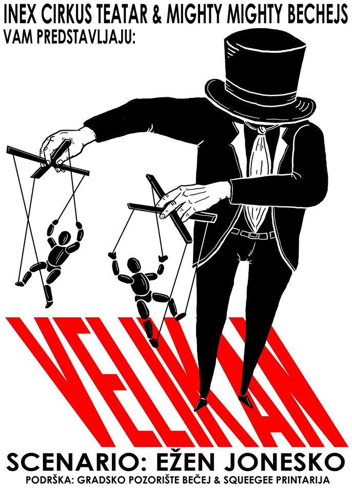 Mighty mighty Bechej`s i Inex cirkus teatar pripremaju za Vas kazališno cirkusku predstavu “Velikan” po scenariju Eugèna Ionesca. Ova komedija o mentalitetu ljudi i paradoksu simpatije prema kvazi idolima bit će upriličena u izvodbi bećejskih amaterskih glumaca i obojena cirkuskom nijansom od strane beogradskih žonglera i akrobata uz podršku Gradskog pozorišta Bečej i Squeegee printarije. Premijerno prikazivanje ove predstave zakazano je za subotu 20.02.2016. godine od 20 sati u Gradskom pozorištu u Bečeju.