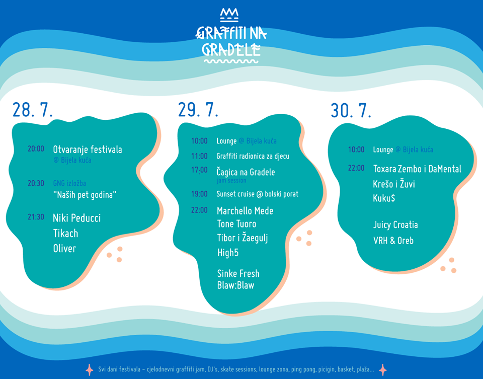 NAPOMENA: također će biti dostupni cjelodnevni sadržaji poput graffiti jamova, DJ i skate sessiona, lounge zona, picigin, basket, ping-pong, kao i, naravno, kupanje na plaži
