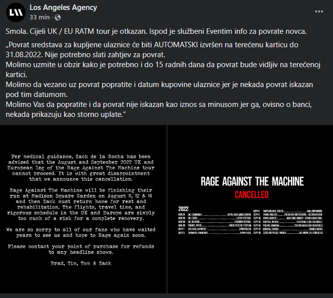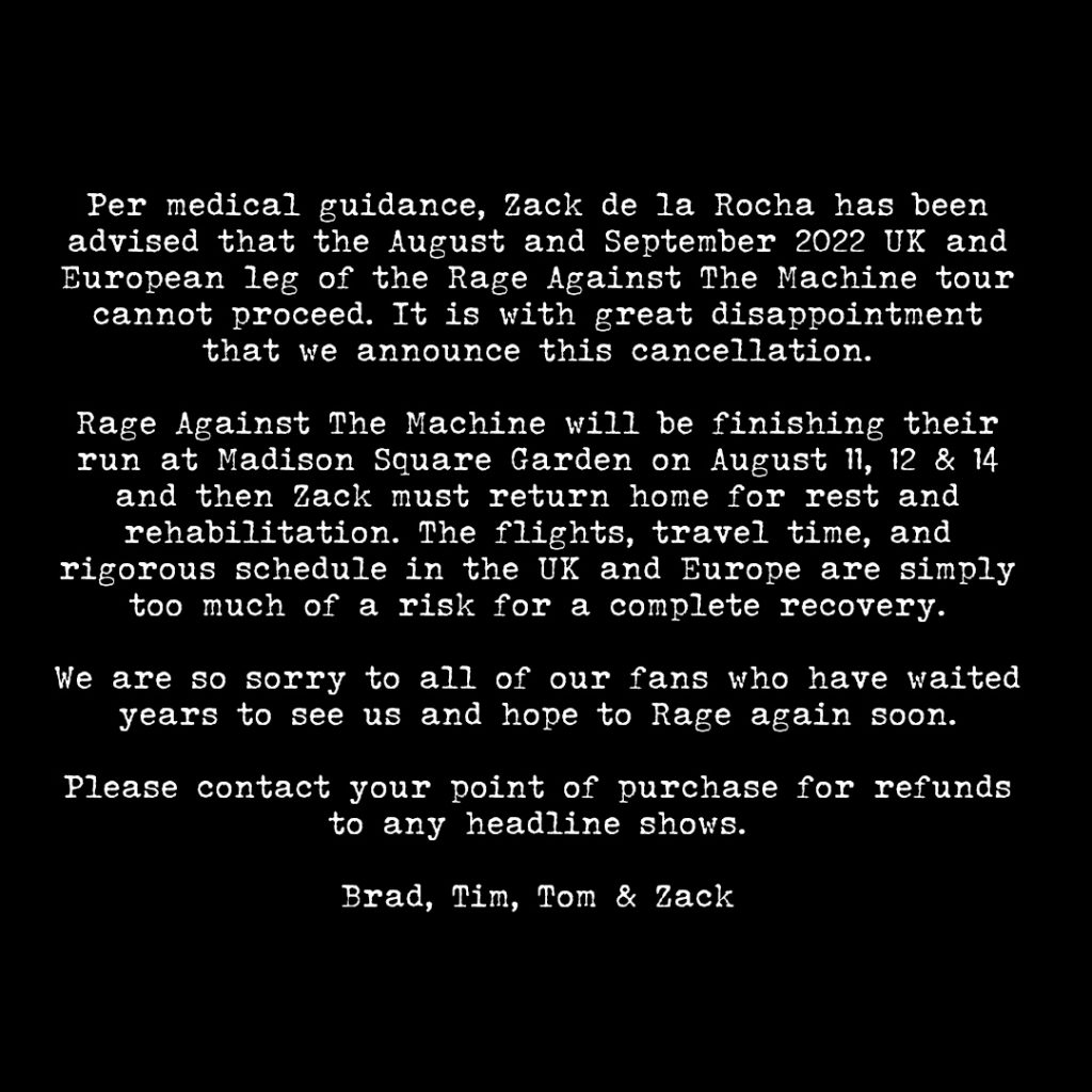 Osim njega, još je vjerojatno bolniji otkaz nesuđenih povratnika Rage Against the Machinea koji su trebali, uz Run the Jewelse, nastupati 17. rujna u Areni. Zach de la Rocha je dobio liječničko mišljenje kako bi bilo najpametnije prekinuti turneju, a obavijest organizatora iz LAA-a također prenosimo u cijelosti: