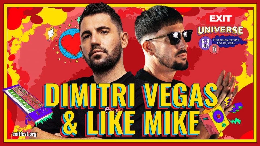 Dvostruki prvaci prestižne DJ Mag liste najboljih svjetskih DJeva Dimitri Vegas & Like Mike proslavljaju dva desetljeća apsolutne dominacije na elektronskoj sceni! U svom glazbenom portfelju imaju rekord za najveći elektronski solo nastup u Njemačkoj, dok su u Belgiji s 60.000 prodanih ulaznica u tri dana prestigli rekorde koje su prije njih postavili U2 i Madonna! Na ovogodišnji EXIT festival donose hitove „Tremor“ (feat. Martin Garrix), „Complicated“ (feat. David Guetta, Kiiara), „Bounce“ (feat. Snoop Dogg), „Hey Baby“ (feat. Diplo), „When I Grow Up“ (feat. Wiz Khalifa) i druge, koji u zbroju imaju više od 1.5 milijardi slušanja samo na YouTubeu!