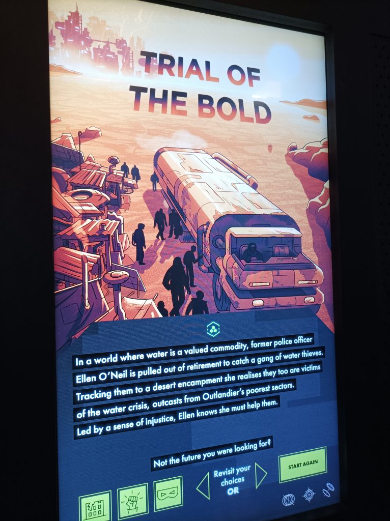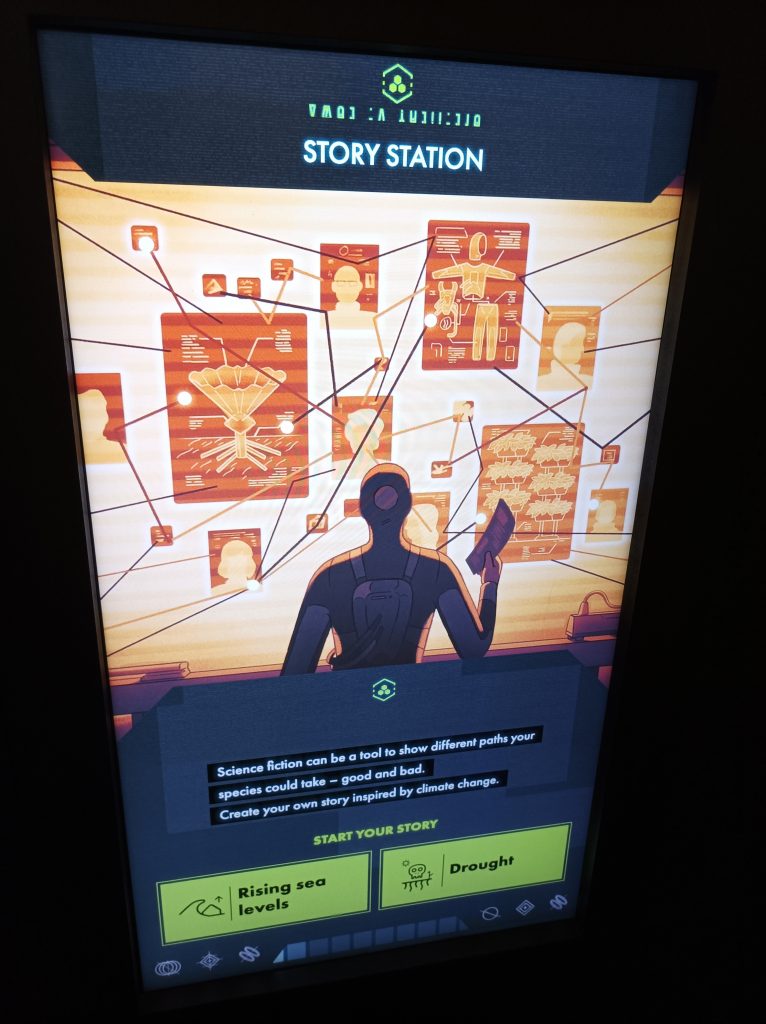 Prije svega, posjetili smo plaćenu i izrazito popularnu izložbu Science Fiction: Voyage to the Edge of Imagination. Vođeni umjetnom inteligencijom izvanzemaljskog podrijetla kroz imerzivnu izložbu, istražili smo nepoznati planet i način na koji su znanstvenici i kreatori znanstvene fantastike zamislili i izgradili nove svjetove kako bi bolje razumjeli naš vlastiti. Tijekom ovog interaktivnog putovanja, nailazili smo na autentične predmete i kostime iz filmova, TV programa i knjiga, kao i slike, umjetnička djela i fotografije. U sklopu izložbe mogli smo osmisliti vlastitu distopijsku priču na temelju dva predloška – povećanje razine more ili velika suša, saznati u kojem postotku smo kiborzi putem simpatične analize korištenja robotskih pomagala te smo mogli procijeniti vlastiti optimizam o postojanju inteligentnih razina života u našoj galaksiji putem Drakeove jednadžbe.