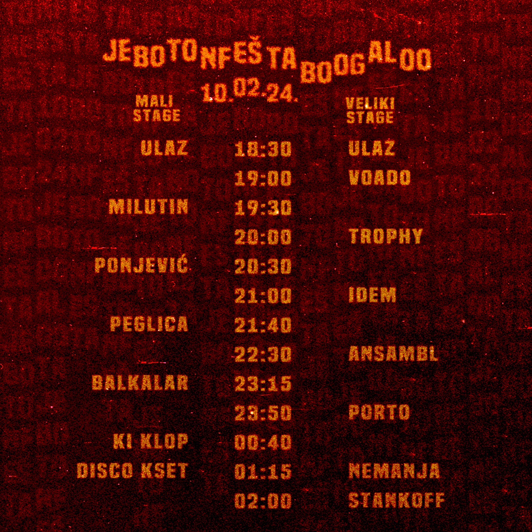 U subotu, 10. veljače 2024. godine JeboTon okupira Boogaloo. Na dva stagea nastupit ćak 13 izvođača. U prodaji je ostalo posljednjih sto ulaznica.