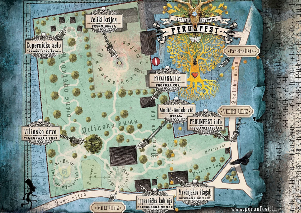 Na jedinstvenoj lokaciji u Donjoj Lomnici, predgrađu Velike Gorice, organiziran je tako tematski festivalski prostor čije lokacije izgledaju, a i zvuče kao nešto iz videoigrice. Tako se možete prošetati Velesovim putem do Velesovog trga na samom ulazu, putom proći do izložbenih prostora raznih rukotvorina, domaćeg craft piva i raznoraznih sajamskih veselja u duhu vremena na Perunovom sajmu kojim dominira totem želja nazvan Veliki krijes, kao nešto iz Wicker Mana.
