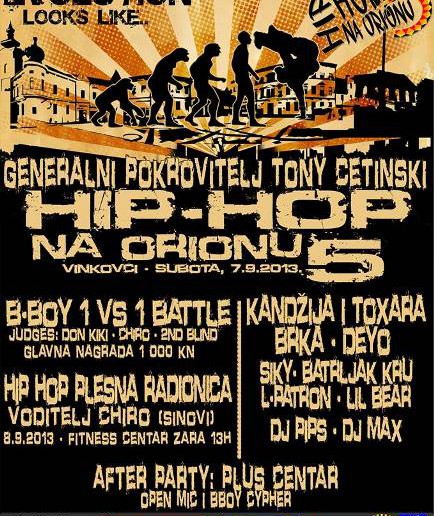Jučer je po peti puta na vinkovačkoj pješačkoj zoni Orion, povodom manifestacije Vinkovačkih jeseni održan ‘Hip – Hop na Orionu.’ Pod generalnim pokroviteljstvom Tonyja Cetinskog, krema slavonske hip – hop scene jučer se okupila pred zgradom vinkovačke gimnazije kako bi na prigodan način proslavila kulturu koju svi volimo.