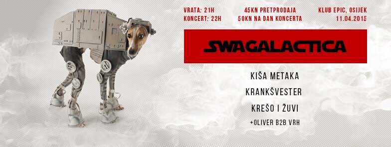 Osječki klub Epic će prekosutra, 11. travnja, u organizaciji Epic Dub Session kolektiva ugostiti kvalitetan rap događaj nazvan Swagalactica. Naime, ove subote zajedno će nastupiti domaće rap super-grupe Krankšvester, Kiša metaka i naposljetku Krešo i Žuvi.