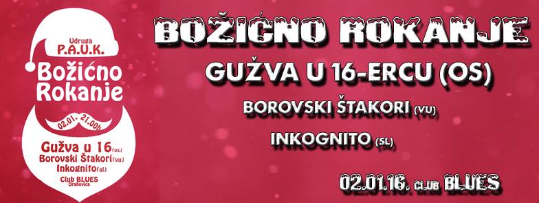 Udruga PAUK Orahovica vas poziva na šesto po redu Božićno rokanje koje se održava u subotu 02. siječnja 2016. s početkom od 21:00 sat u Clubu Blues u Orahovici.