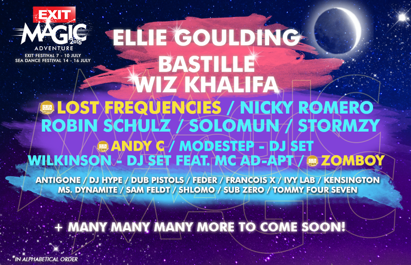 Exit festival održat će se ove godine od 7. do 10. srpnja na Petrovaradinskoj tvrđavi, a zatim Exit Avantura putuje na Jadransko more zbog trećeg Sea Dance festivala od 14. do 16. srpnja. Uz Ellie Goulding, nastupe su već potvrdili Wiz Khalifa, Bastille, Stormzy, Lost Frequencies, Solomun, Robin Schulz, Nicky Romero, Zomboy, Wilkinson, Ms. Dynamite, Dub Pistols, Kensington, FederSam Feldt, DJ Hype, Andy C, Modestep, Ivy Lab, Sub Zero, Tommy Four Seven, Antigone, Francois X Shlømo.