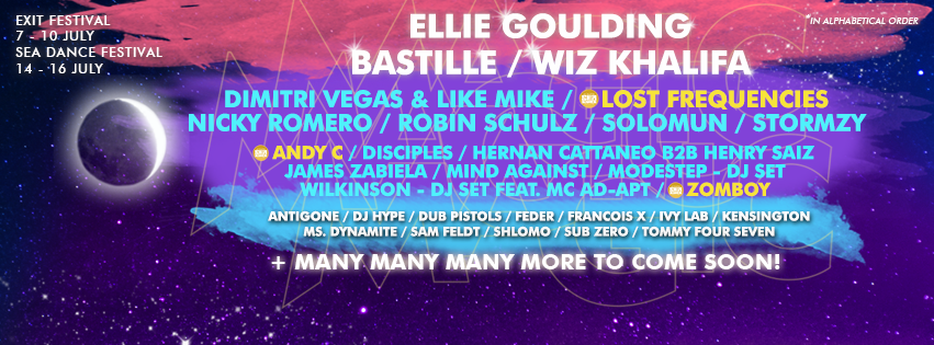 Exit festival održat će se ove godine od 7. do 10. srpnja na Petrovaradinskoj tvrđavi, a zatim Exit Avantura putuje na Jadransko more radi trećeg Sea Dance festivala od 14. do 16. srpnja. Nastupe su već potvrdili Ellie Goulding, Wiz Khalifa, Bastille, Dimitri Vegas & Like Mike, Stormzy, Lost Frequencies, Solomun, Robin Schulz, Nicky Romero, Ms. Dynamite, Zomboy, Wilkinson, Mind Against, Disciples, Dub Pistols, Kensington, Feder, Sam Feldt, DJ Hype, Andy C, Modestep, Ivy Lab, Sub Zero, Hernan Cattaneo b2b Henry Saiz, James Zabiela, Tommy Four Seven, Antigone, Francois X i Shlømo.