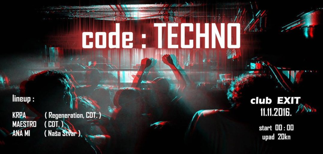11. studenog u osječkom klubu Exit, održava se novi program pod nazivom code: Techno. Glavni protagonisti ove priče su dvojica mladih DJ-eva, Antonio Krmpotić (Krpa) i Davor Kletuš (Maestro). Uz ovaj dvojac moći ćete čuti i nešto drukčiji glazbeni program .