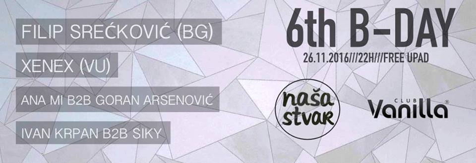 Povodom proslave 6. rođendana vinkovački kolektiv Naša Stvar priprema tulum u svima poznatom Vanilla Clubu. Stoga, svi ljubitelji techno glazbe i njenih varijacija trebaju se zaputiti u Vinkovce sutra, 26.11., jer čeka ih prava plesna poslastica.