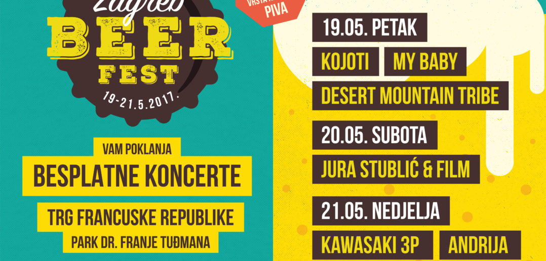 Zagrebački Park dr. Franje Tuđmana se od 19. do 21. svibnja pretvara u veliku pozornicu, a Zagreb Beer Fest poziva sve da se pridruže u vikendu dobre pive i dobrih koncerata. U petak 19. svibnja u Parku dr. Franje Tuđmana svirat će Kojoti, My Baby i Desert Mountain Tribe, 20. svibnja svirat će Jura Stublić & Film, a dan kasnije Kawasaki 3P, Artan Lili i Andrija. Organizator festivala je Yem.