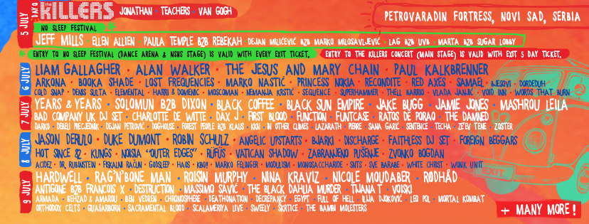 Detaljnije, što se EXITA tiče – on se ove godine održava od 6. do 9. srpnja na standardnoj lokaciji Petrovaradinske tvrđave, dok će biti organiziran i tzv. nulti dan 5. srpnja kojeg će predvoditi američki The Killers.