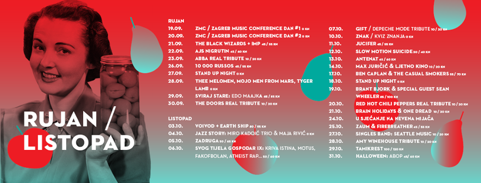 Od istaknutijih izvođača (uz nezaobilazne tribute večeri) u mjesecu rujnu očekuju nas: The Black Wizards+Imp, Ajs Nigrutin, Edo Maajka, dok u listopadu stižu Vojvod + Earth Ship, Zadruga, Atheist Rap, Motus, Jucifer, Antenat, Ben Caplan & The Casual Smokers, Brant Bjork & Sean Wheeler, Tamikrest i ABOP.