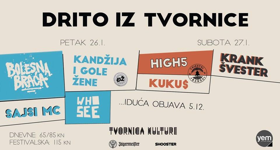 Treće izdanje nečega što bi moglo postati zimski hip-hop festival, Drito iz Tvornice, održati će se u siječnju 2018. godine, 26. i 27. u mjesecu. Lokacija je Tvornica kulture, a organizacija je objavila nova tri imena koji se pridružuju High5, KUKU$-u, Kandžiji i Golim ženama te Bolesnoj Braći.