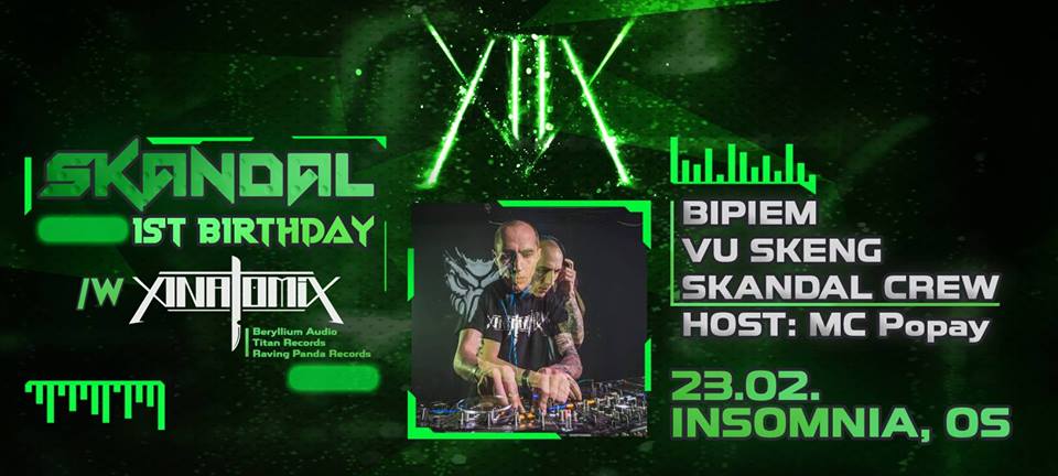 Također na prvi rođendan dolazi i Vu Skeng, mladi Dnb DJ iz Novog Sada koji je u svojoj vrlo mladoj i kratkoj karijeri već imao nastup na Exit festivalu kojim se može pohvaliti. Za kraj bit će tu i rezidenti kolektiva Skandal. Host eventa je MC Popay iz Zagreba. Rođendan će se održati u osječkom klubu Insomnia na datum 23. veljače, a informacije o cijenama karata bit će poznate uskoro.