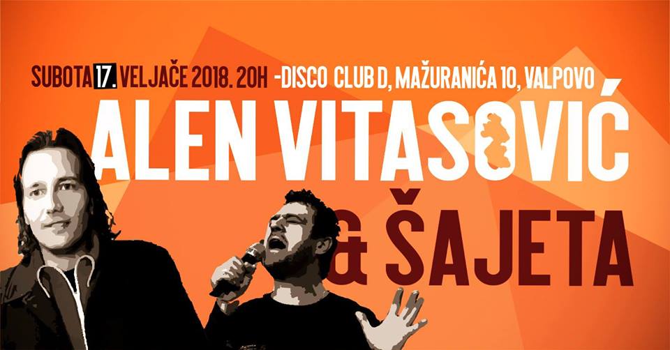 Dvojac hrvatskih pop zabavljača, Alen Vitasović i Šajeta, gostuju ove subote, 17. veljače, u slavonskoj paradržavi unutar Valpova – Karašickoj republici. Lokacija koncerta je disco klub D.