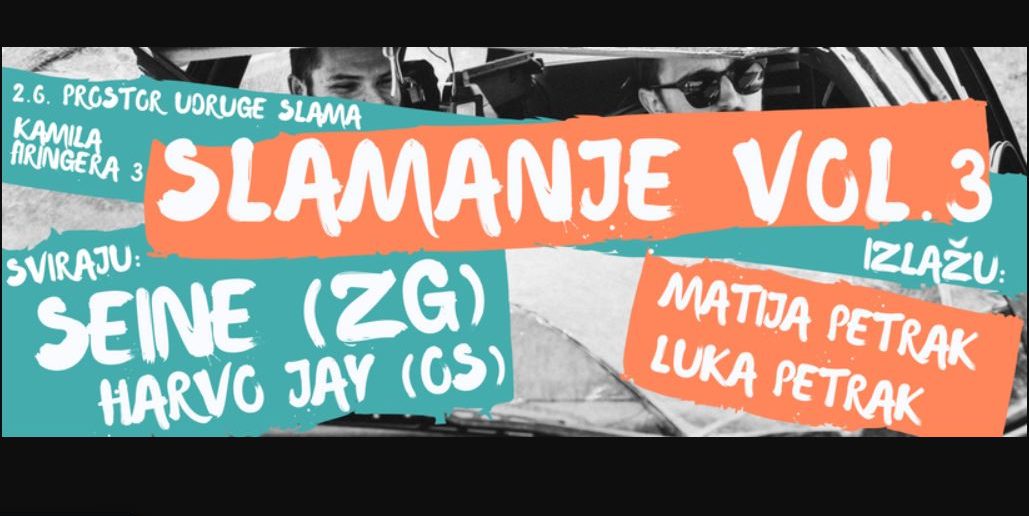 Slamanje je projekt koji povezuje glazbu, likovnu umjetnost i hranu u jedan kulturno raznolik društveni događaj. Osim glazbenog programa gdje će svirati Seine i Harvo Jay, posjetitelji će se “slamati” i uz izložbu Matije i Luke Petraka. Događaj će se održati u prostoru udruge Slama, u ulici Kamila Firingera 3.