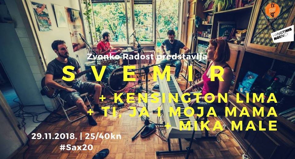 U četvrtak, 29.studenoga, u Sax dolazi Svemir, a uz bendove Kensington Lima i Ti, ja i moja mama kao gosti će nastupiti i Mika Male