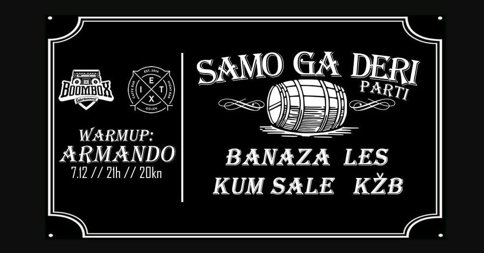 “Samo ga deri party” održat će se u osječkom klubu Exit 7. prosinca u organizaciji Boombox ekipe. Na samom događaju nastupat će trap grupa Kažnjenička Bojna, osječki rap veteran Les, čepinsko-osječki mc Kum Sale te mladi reper Banaza. Publiku će za DJ pultom zagrijavati Armando.
