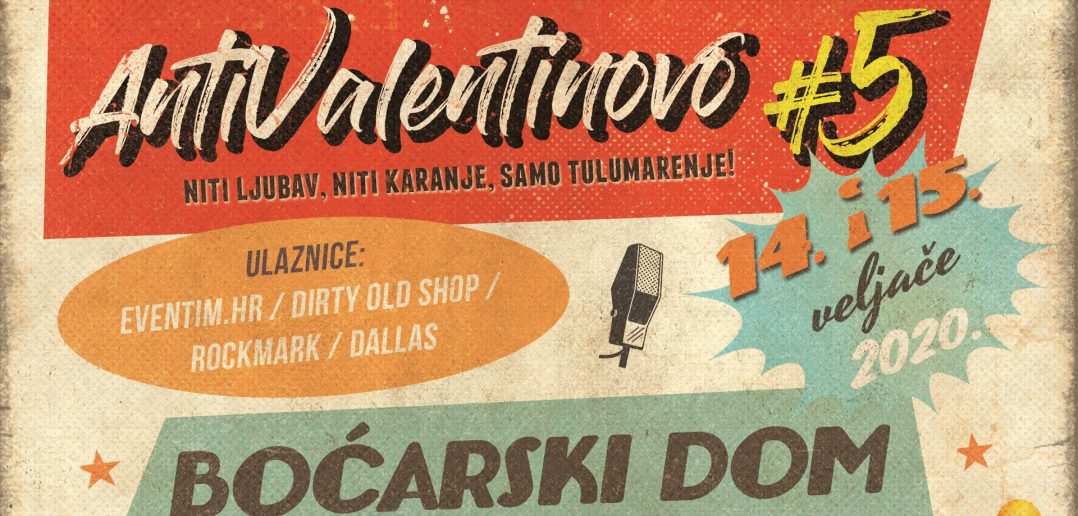 Antivalentinovska petica koja će se održati u petak 14.02. i subotu 15.02.2020., u Boćarskom domu, bit će definitivno najluđe izdanje tradicionalnog festivala koji u mjesecu zaljubljenih svake godine željno iščekuju svi koji žele dobar provod i pravu feštu ove godine pod sloganom – ‘Niti ljubav, niti karanje, samo tulumarenje!’