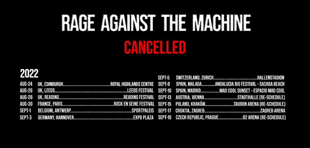 Osim njega, još je vjerojatno bolniji otkaz nesuđenih povratnika Rage Against the Machinea koji su trebali, uz Run the Jewelse, nastupati 17. rujna u Areni. Zach de la Rocha je dobio liječničko mišljenje kako bi bilo najpametnije prekinuti turneju, a obavijest organizatora iz LAA-a također prenosimo u cijelosti: