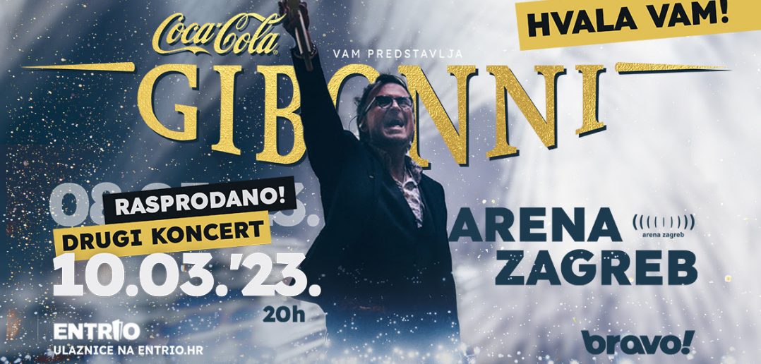 Ulaznice za Gibonnijev drugi koncert u Areni Zagreb koji podržava bravo! u prodaju kreću 2. siječnja 2023. u 12 sati i možete ih nabaviti u sustavu Entrio.