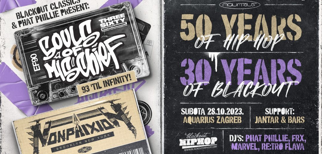 U godini kada Hip-Hop slavi 50. rođendan, organizacija Blackout Hip Hop se u punoj snazi vraća u prostore zagrebačkog hrama Hip-Hopa, klub Aquarius, da proslave 30 godina rada te dovode legendarna imena s američke scene – Souls Of Mischief i Non Phixion.
