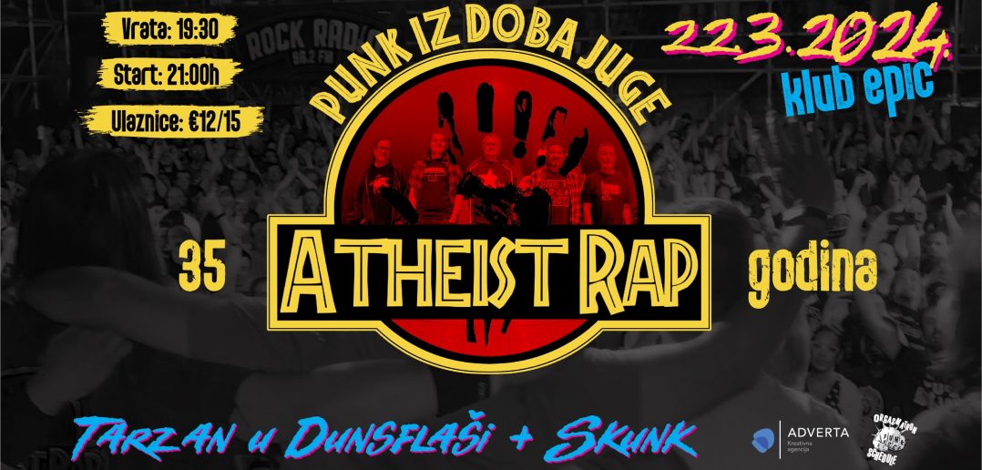 Veterani punk scene, Atheist Rap, čitavu karijeru uspješno grade po svom principu, a uz ikone poput KUD Idijota ili Hladnog piva drže titulu stupa scene koji je zaslužan za razvoj punk rocka na ovim prostorima. Jubilarni koncert u klubu Epic svojevrsna je lektira koja će ih u slavljeničkom tonu prikazati u uistinu punoj sviračkoj snazi s izuzetnom energijom kakvu odašilju već tri i pol desetljeća.