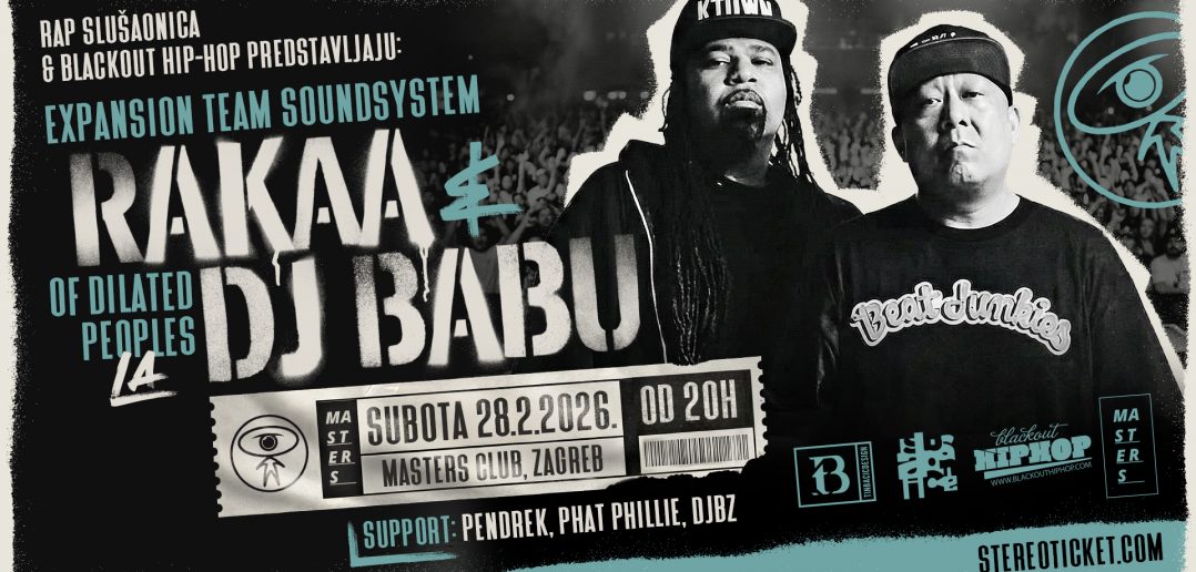 Blackout Hip-Hop i Rap Slušaonica udružili su se kako bi nam donijeli vrlo poseban događaj. U subotu 28.2. u Masters Club dolaze DJ Babu i Rakaa Iriscience, dvije trećine kultnih Dilated Peoples iz Los Angelesa.